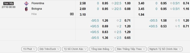 Bảng Tỷ lệ kèo bóng đá Fiorentina vs Bologna