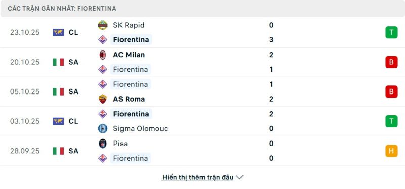 Fiorentina đang trải qua giai đoạn đầy thử thách khi chỉ giành được 3 điểm sau 7 vòng đấu và tạm đứng ở vị trí thứ 18 trên bảng xếp hạng Serie A. Đội bóng áo tím có phong độ phập phù với những thất bại đáng tiếc trước Milan, Roma và Como. Dù vậy, họ vẫn cho thấy sức sống nhất định ở đấu trường châu Âu khi đánh bại Rapid và Sigma Olomouc tại UEFA Conference League. Tuy nhiên, hàng công vẫn chưa thực sự ổn định, trong khi hệ thống phòng ngự còn nhiều khoảng trống, khiến đội bóng liên tục đánh mất lợi thế trong các trận cầu then chốt.