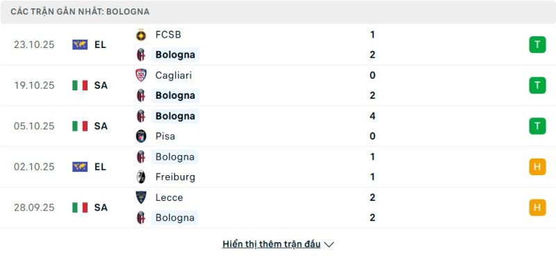 Bologna lại thể hiện hình ảnh hoàn toàn trái ngược với chuỗi kết quả ấn tượng. Sau 7 vòng đấu, họ đang nằm trong top 5 đội dẫn đầu, sở hữu 13 điểm và chỉ kém nhóm đầu bảng đôi chút. Đội bóng áo đỏ-xanh vừa thắng thuyết phục Pisa và Cagliari, đồng thời chơi ấn tượng ở Europa League khi đánh bại FCSB ngay trên sân khách. Lối chơi của họ ngày càng chắc chắn nhờ hàng thủ kỷ luật và tuyến giữa kiểm soát tốt nhịp độ. Dù đôi khi vẫn gặp khó trong khâu dứt điểm, Bologna đang duy trì sự ổn định đáng nể và tinh thần tự tin cao trước chuyến hành quân này.