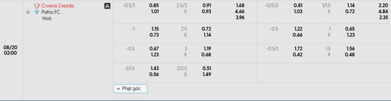 Bảng Tỷ lệ kèo bóng đá FK Crvena zvezda vs Pafos FC