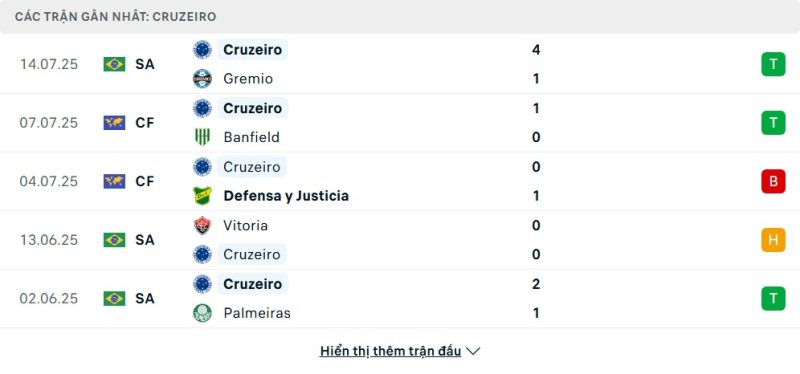 5 trận gần nhất của Cruzeiro: W-W-L-D-W