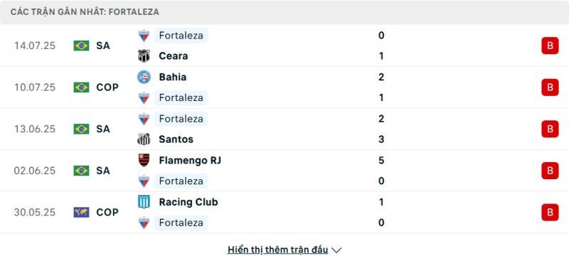 5 trận gần nhất của Fortaleza: L-L-L-L-L
