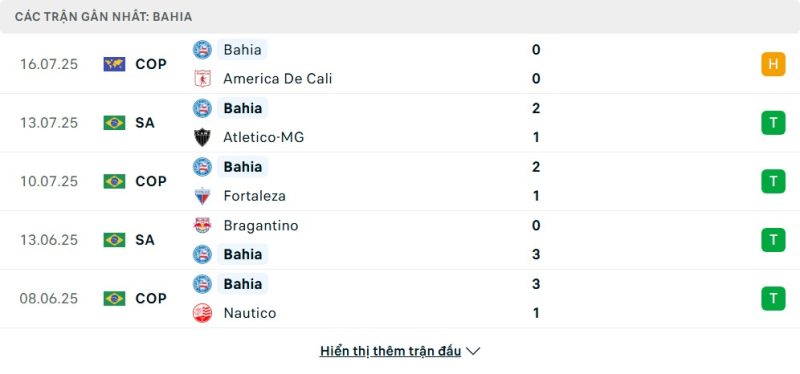 5 trận gần nhất của Bahia: D-W-W-W-W