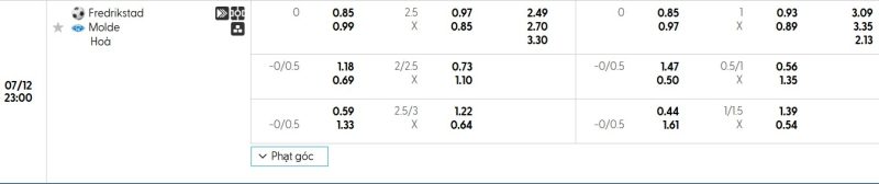 Bảng Tỷ lệ kèo bóng đá Fredrikstad vs Molde