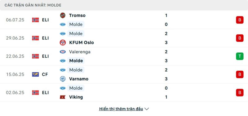 5 trận gần nhất của Molde: L-L-W-L-L