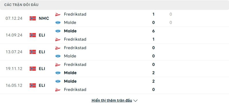 Thành tích đối đầu của Fredrikstad vs Molde