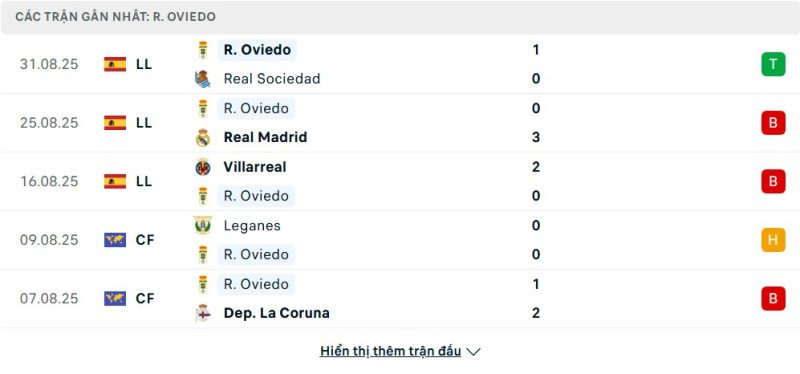 5 trận gần nhất của Real Oviedo: W-L-L-D-L