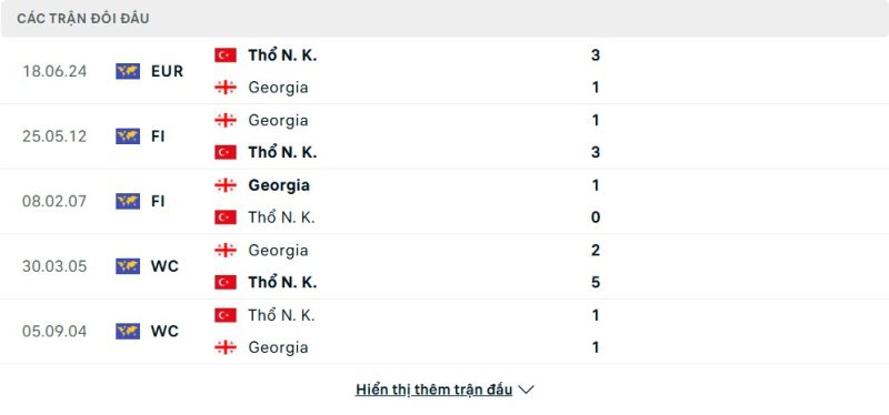 Thành tích đối đầu của Gruzia vs Thổ Nhĩ Kỳ