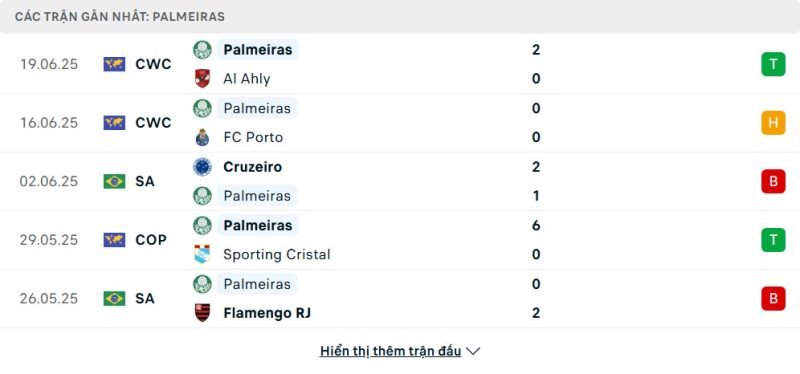5 trận gần nhất của Palmeiras: W-D-L-W-L