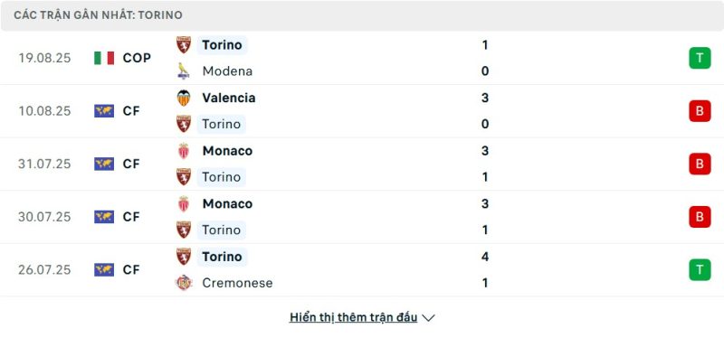5 trận gần nhất của Torino: W-L-L-L-W