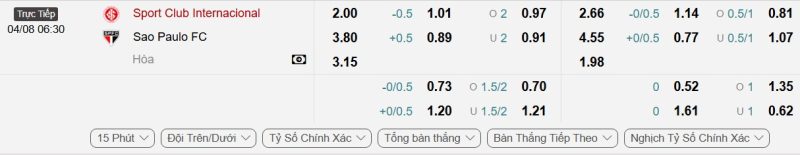 Bảng Tỷ lệ kèo bóng đá Internacional vs São Paulo