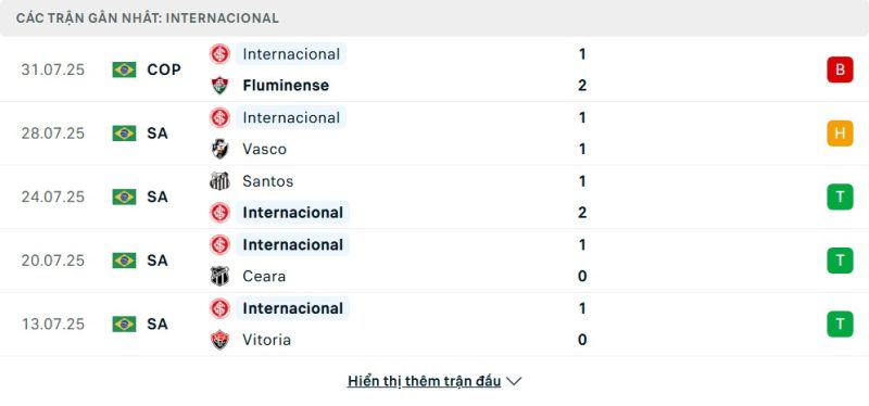Phong độ gần đây của Internacional khá thất thường. Họ hiện đang đứng thứ 10 trên bảng xếp hạng với 21 điểm sau 16 trận đấu. Trong 5 trận gần nhất trên mọi đấu trường, Internacional có 2 chiến thắng, 1 trận hòa và 2 trận thua. Đáng chú ý, họ đã để thua 1-2 trước Fluminense, nhưng trước đó lại có những chiến thắng thuyết phục trước Ceara và Vitoria. Điều này cho thấy Internacional cần phải cải thiện sự ổn định.