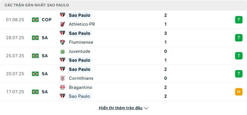 5 trận gần nhất của São Paulo: W-W-W-W-D