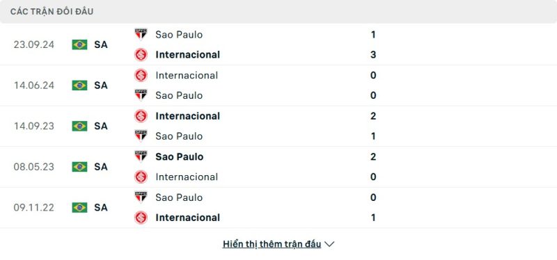 Thành tích đối đầu của Internacional vs São Paulo