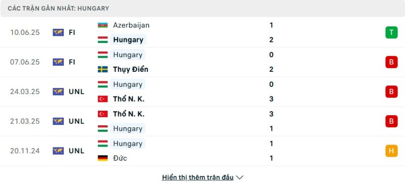 5 trận gần nhất của Hungary: W-L-L-L-D