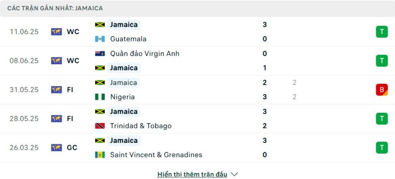5 trận gần nhất của Jamaica: W-W-D-W-W