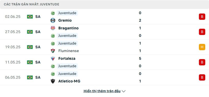 5 trận gần nhất của Juventude: L-L-D-L-L