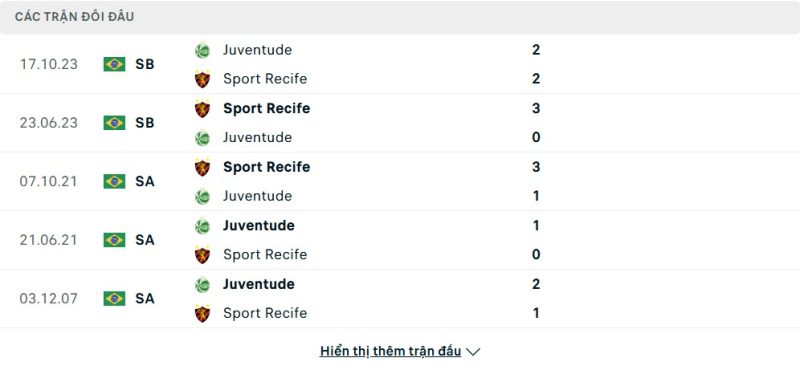 Thành tích đối đầu của Juventude vs Sport Recife