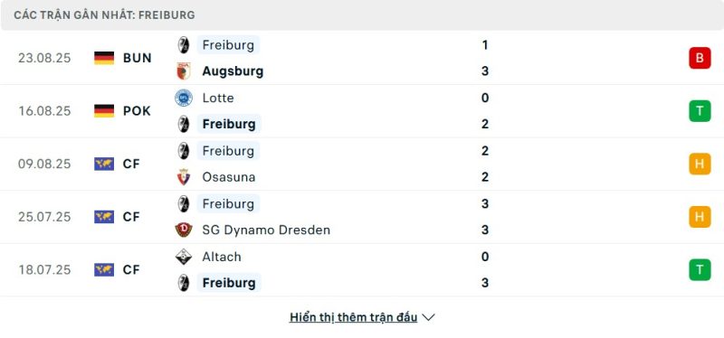 Bên kia chiến tuyến, SC Freiburg lại bắt đầu mùa giải mới với nhiều nỗi lo. Dù đã có chiến thắng 2-0 trước Lotte ở DFB Pokal, họ lại bất ngờ gục ngã 1-3 ngay trên sân nhà trước Augsburg trong trận mở màn Bundesliga. Thất bại này đã đẩy đoàn quân của HLV Christian Streich xuống vị trí thứ 16, một khởi đầu đáng báo động. Nhìn rộng hơn, phong độ của Freiburg đã có dấu hiệu bất ổn từ cuối mùa giải trước, và trận thua gần nhất càng làm dấy lên những nghi ngại về khả năng cạnh tranh của đội bóng ở mùa giải năm nay.