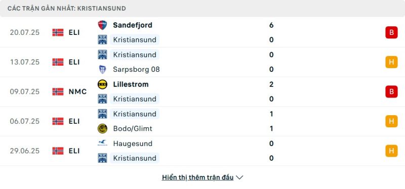 5 trận gần nhất của Kristiansund: L-D-L-D-D