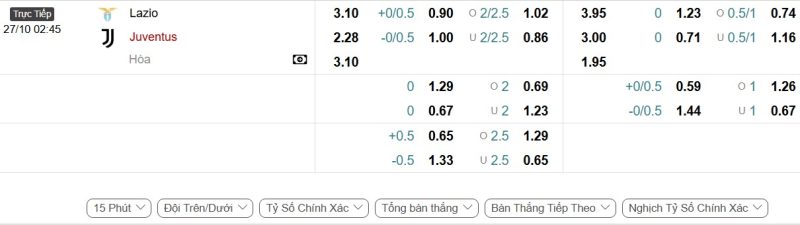Bảng Tỷ lệ kèo bóng đá Lazio vs Juventus
