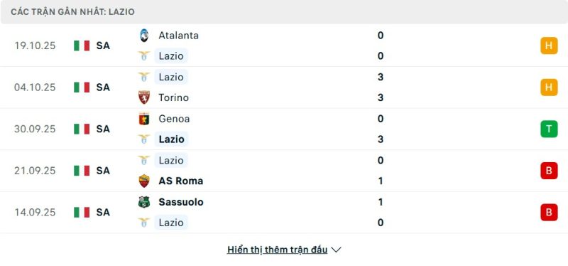 5 trận gần nhất của Lazio: D-D-W-L-L