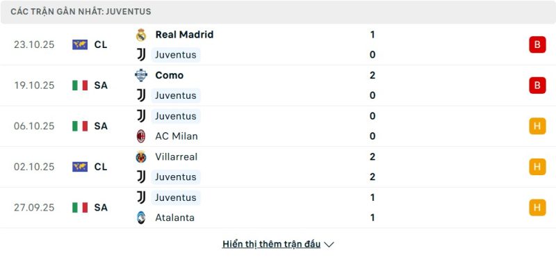 5 trận gần nhất của Juventus: L-L-D-D-D