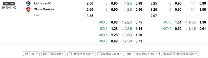 Bảng Tỷ lệ kèo bóng đá Le Havre vs Brest