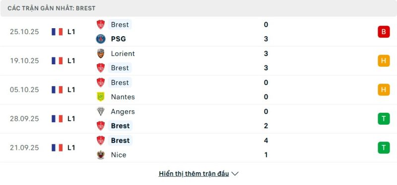 5 trận gần nhất của Brest: L-D-D-W-W