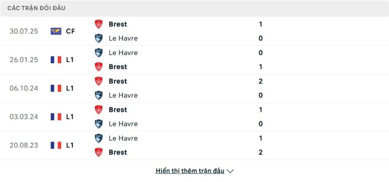 Thành tích đối đầu của Le Havre vs Brest