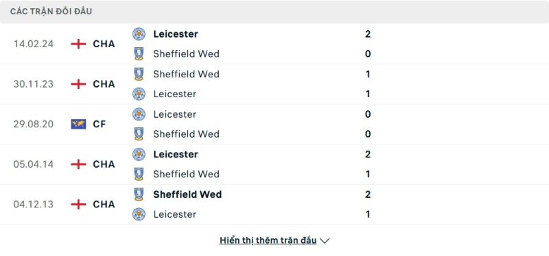 Thành tích đối đầu của Leicester City vs Sheffield Wednesday