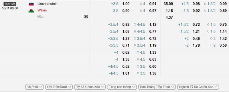 Bảng Tỷ lệ kèo bóng đá Liechtenstein vs Xứ Wales
