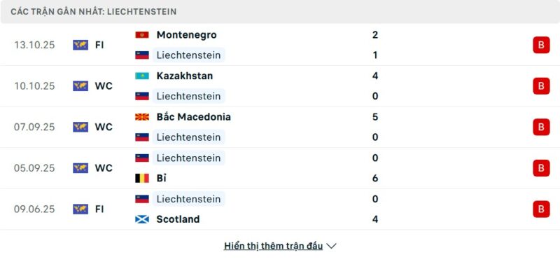 5 trận gần nhất của Liechtenstein: L-L-L-L-L