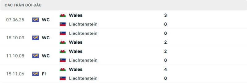 Thành tích đối đầu của Liechtenstein vs Xứ Wales