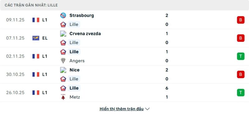5 trận gần nhất của Lille: L-L-W-L-W