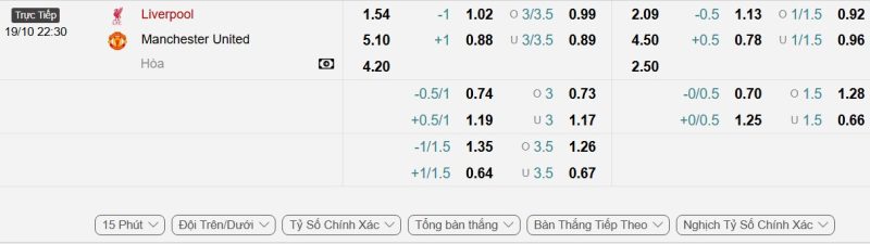 Bảng Tỷ lệ kèo bóng đá Liverpool vs Manchester United