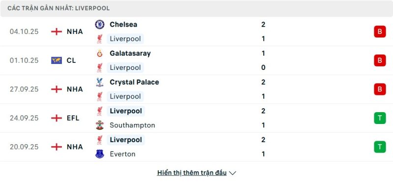 5 trận gần nhất của Liverpool: L-L-L-W-W