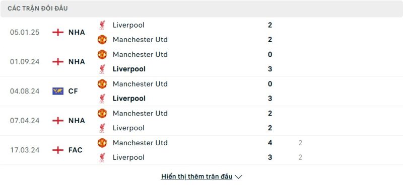 Thành tích đối đầu của Liverpool vs Manchester United