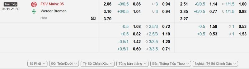 Bảng Tỷ lệ kèo bóng đá Mainz 05 vs Werder Bremen