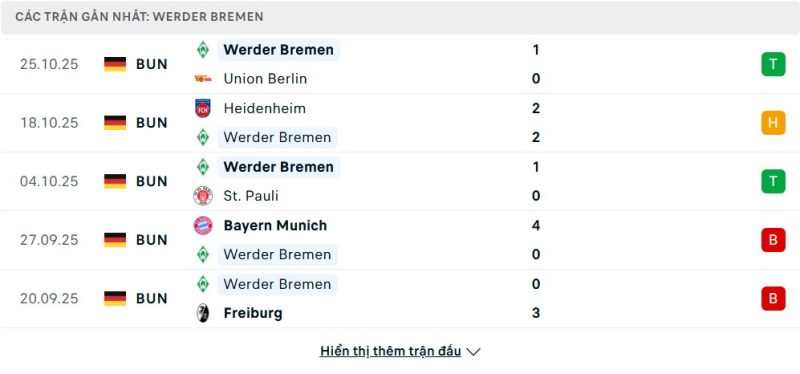 5 trận gần nhất của Werder Bremen: W-D-W-L-L