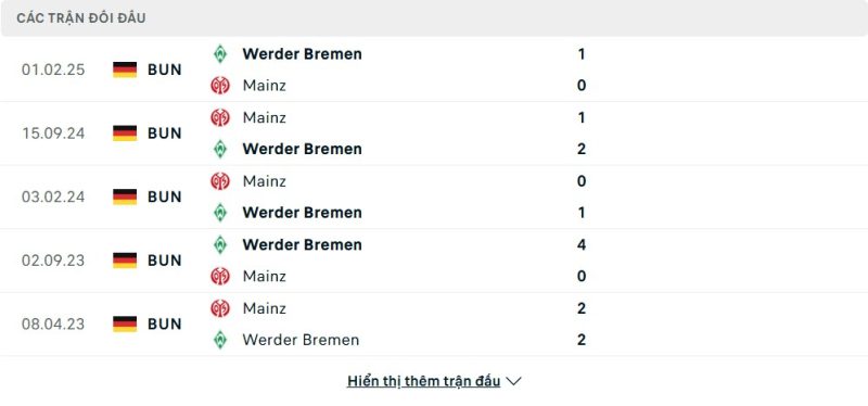 Thành tích đối đầu của Mainz 05 vs Werder Bremen