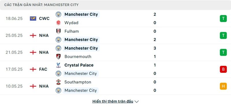 Thống kê phong độ gần đây Manchester City vs Al-Ain