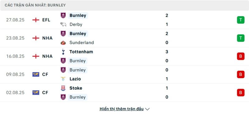 5 trận gần nhất của Burnley: W-W-L-L-L