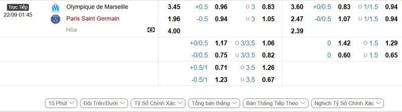 Bảng Tỷ lệ kèo bóng đá Marseille vs Paris Saint-Germain