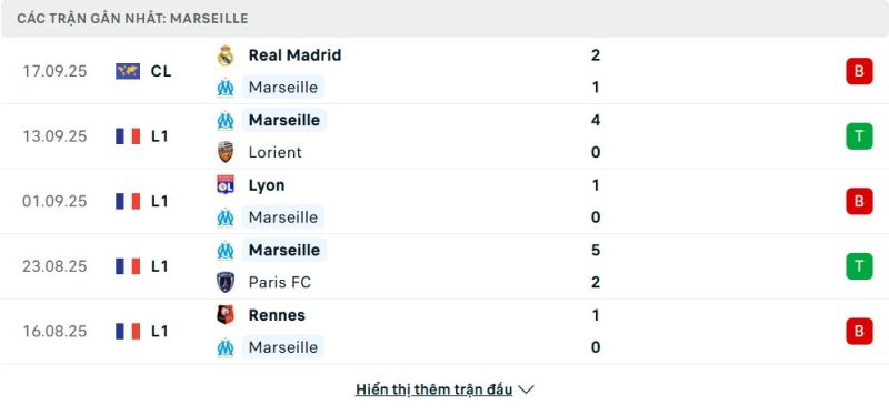 5 trận gần nhất của Marseille: L-W-L-W-L