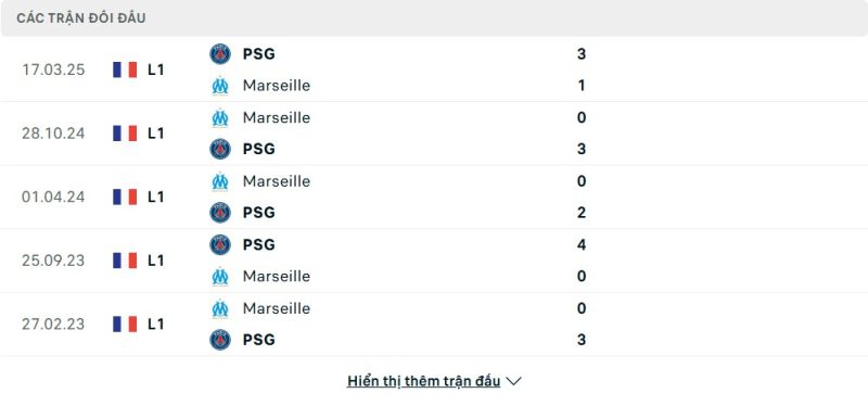 Thành tích đối đầu của Marseille vs Paris Saint-Germain