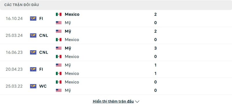 Thống kê phong độ gần đây Mỹ vs Mexico