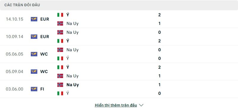 Thành tích đối đầu của Na Uy vs Italia