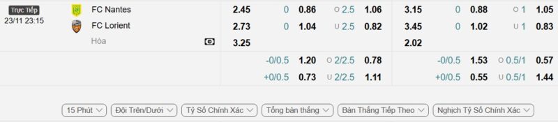 Bảng Tỷ lệ kèo bóng đá Nantes vs Lorient