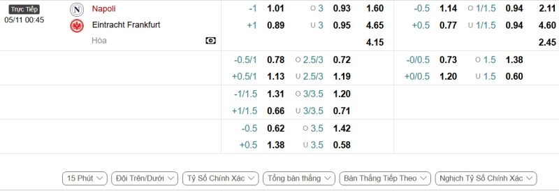 Bảng Tỷ lệ kèo bóng đá Napoli vs Eintracht Frankfurt